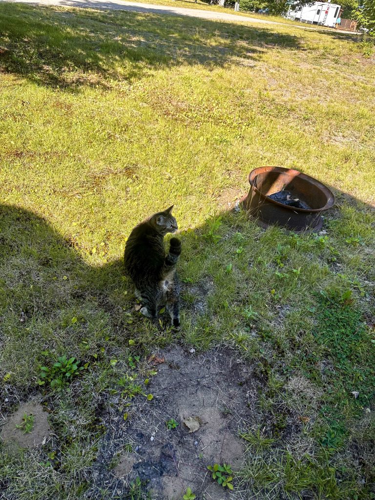 The site itself is not perfectly level. We did not put blocks under the tires, which we probably should have. Nothing was rolling around in a dangerous way, but a few unlocked cabinet doors did have a habit of slowly swinging open on their own. Lesson learned for next time. The site had just enough shade to stay comfortable without blocking our Starlink signal, which was a nice balance. The picnic table was included and usable, though not in the best shape. The fire ring was solid, and we appreciated that we were allowed to move it if needed.